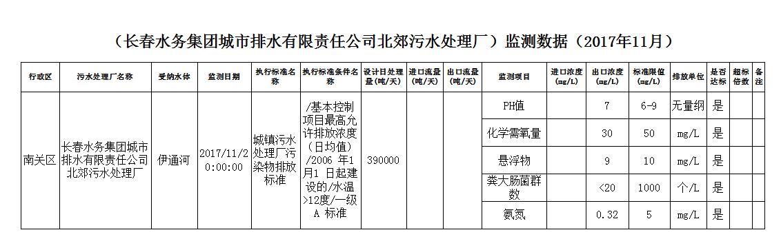 (长春水务集团城市排水有限责任公司北郊污水处理厂)监测数据(2017年11月)